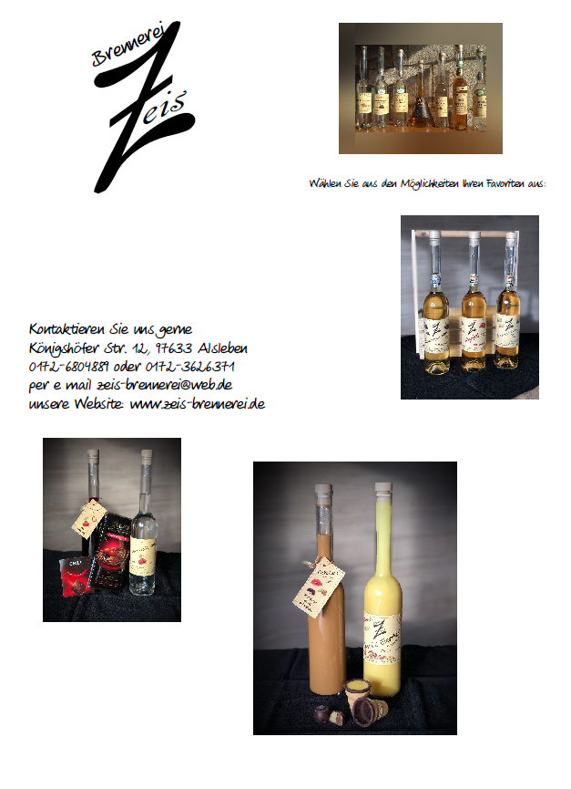 weitere Bewertungen finden Sie hier und lassen Sie auch gern Ihre da | KontaktBrennerei Karlheinz ZeisKönigshöferstr. 1297633 AlslebenTel.: +49 9763 1460 Mobil: +49 172 3626371 E-Mail: zeis-brennerei@web.de |